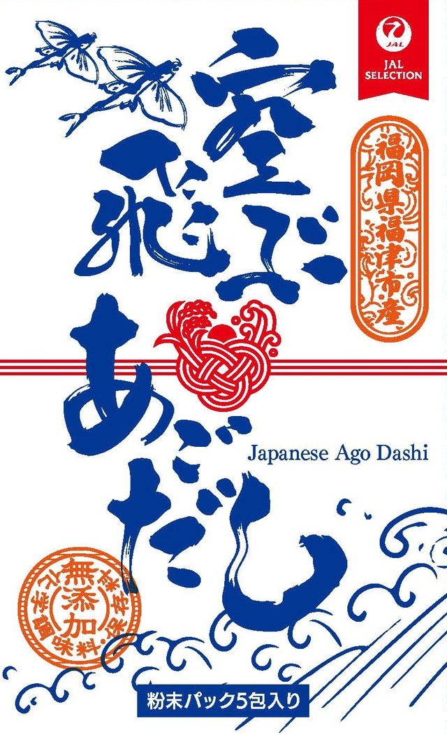 商品名:空飛ぶあごだし(40g×5包入) ■ 福岡県福津市産の贅沢な旨味をあなたの食卓に! JALふるさとプロジェクトから、九州の美味しさをぎゅっと詰め込んだ「空飛ぶあごだし」が登場! 玄界灘(福津市)で水揚げされたトビウオのアラは、未利用のまま廃棄されていおり、 「JAL]・「福津市」・「福津いいざい」の三者が連携しトビウオのアラを有効活用して 開発した出汁パックです。 環境負荷の低減と食品ロス削減に貢献しつつ、化学調味料・保存料不使用で優しい自然な味わいを実現したサステナブルな商品です。 「空飛ぶあごだし(40g×5包入)」で、福岡の味をお楽しみください! 福岡県福津市産のトビウオのアラを贅沢に粉末にした「空飛ぶあごだし」が、あなたの料理を一段と引き立てます。 風味豊かなだしで、手軽に地元の味を再現できるのが魅力です。 このだしは、簡単に調理できるので、忙しい日常にもぴったり!お味噌汁や煮物、魚介料理などに加えることで、深い旨みとコクをプラス。さらには、ドレッシングや和え物にもぴったりです。家族や友人との食事をより一層楽しむためのアイテムとして、食卓にも彩りを添えてくれることでしょう。 また、お料理好きな方への贈り物や、ちょっとした手土産にもおすすめ。地域と共に作られたこの素敵なあごだしで、福岡の豊かな味わいをぜひご堪能ください! ※※こちらの商品は、ネコポス配送の為「受取日時指定不可」となります。 在庫の状況により、発送に時間をいただく場合がございますのでご了承ください。※※ ■こちらの商品は、ギフト対応(のし紙、包装)は お受けしておりませんのでご了承ください。■